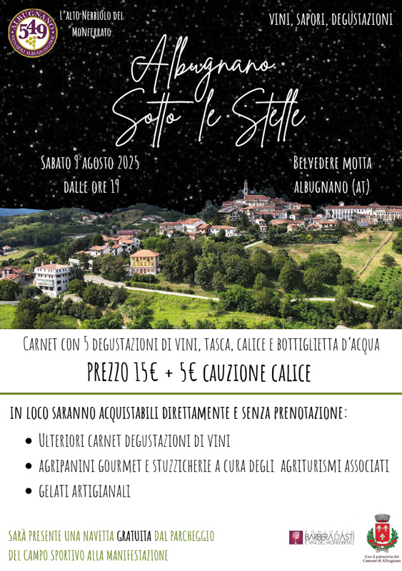 Descrizione title Si invitano i cittadini all'evento "Albugnano sotto le stelle" che si terrà Sabato 9 agosto 2025 dalle ore 19:00 presso il Belvedere Motta di Albugnano.Carnet con 5 degustazioni di vini, tasca, calice e bottiglietta d'acqua: 15 € più 5 € per cauzione calice.Saranno inoltre acquistabili senza prenotazione:Ulteriori carnet degustazione vini;Agripanini gourmet e stuzzicherie;Gelati artigianali;Navetta gratuita dal parcheggio del campo sportivo alla manifestazione.