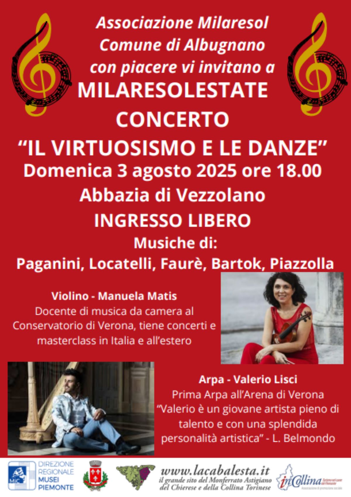 Descrizione title Si invitano i cittadini al concerto "Il virtuosismo e le danze" a cura dell'associazione "Milaresolestate" che si terrà Domenica 3 agosto alle ore 18:00 presso l'Abbazia di Vezzolano.Esibizione di Manuela Matis, docente di musica da camera al conservatorio di Verona, al violino e Valerio Lisci, Prima Arpa all'Arena di Verona, con musiche di Paganini, Locatelli, Faurè, Bartok e Piazzolla.Ingresso libero.