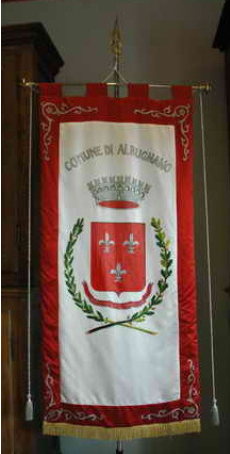 GONFALONE: Drappo di bianco con la bordatura di rosso,riccamente ornato di ricami d'argento e caricato dello stemma comunale, con l'iscrizione centrata in argento: COMUNE DI ALBUGNANO. Le parti di metallo ed i cordoni saranno argentati. L'asta verticale sarà ricoperta di velluto azzurro con bullette argentate poste a spirale. Nella freccia sarà rappresentato lo stemma del Comune e sul gambo inciso il nome. Cravatta e nastri tricolorati dai colori nazionali frangiati d'argento'